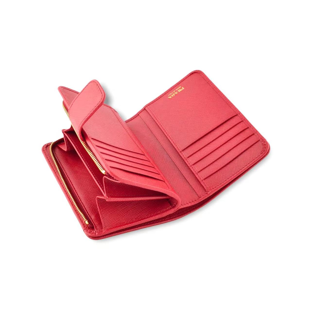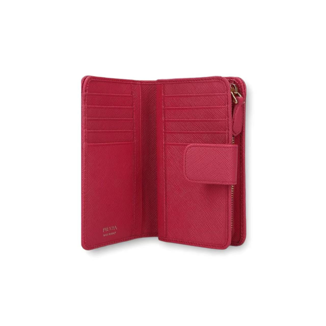 ダークピンクのサフィアーノレザーを使用したプラダのコンパクトウォレット。ゴールドトーンの金具とスナップボタン留めが特徴です。布張りの内側には札入れ、スリップポケット3つ、カードスロット10個を備えています。ジップ付きコインポケット1つと、前面にあしらわれたメタルレタリングロゴがデザインを彩ります。